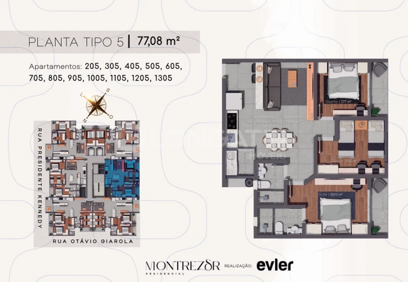 - Áreas dos apartamentos variam de 77,08 m² a 167,52 m².