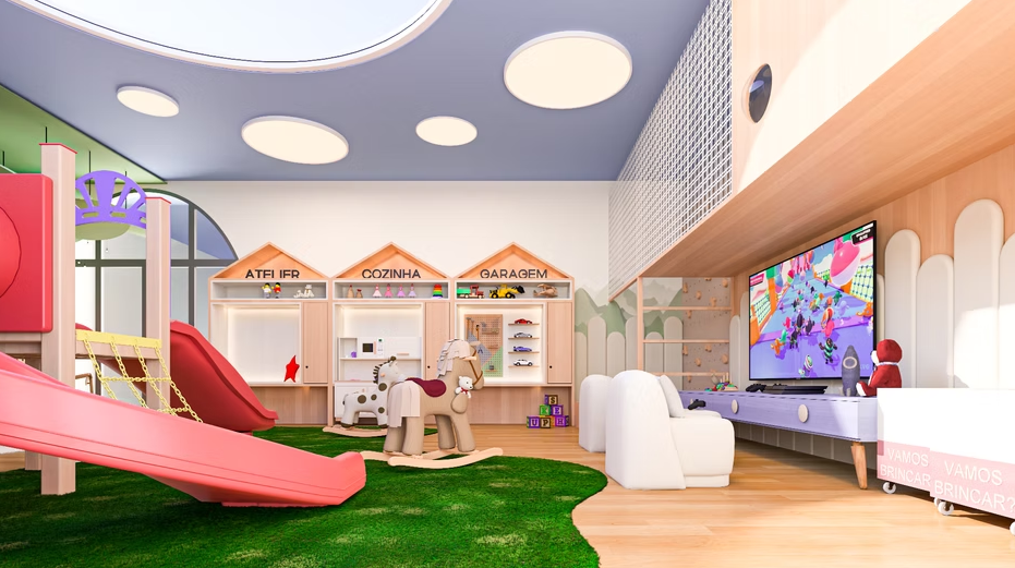 - Entre os itens de lazer destacados no site: piscina, deck com acessibilidade, sky-bar, espaço luau, academia, cinema, coworking, sauna, playground, área gourmet, salão de festas etc.